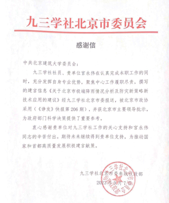 学校九三学社社员、学院宫永伟教授的《关于北京市极端降雨情况分析及防灾策略新技术应用的建议》被市政协采纳。九三学社专门发信致谢学校。