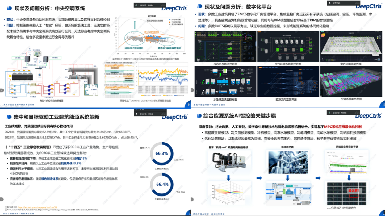 常晓敏是清华大学创新领军工程博士,是深度智控公司的联合创始人兼CTO,公司入选国家级高新技术企业,产品成功落地宁德时代、比亚迪、腾讯数据中心等标杆项目,成果先后获得住建部绿色创新奖一等奖、IDG全球数字化创新50强等多项大奖。他以《“十四五”工业绿色发展规划》为切入点,介绍了当前国家政策以及行业发展现状,随后从能源优化控制的发展历程、综合能源AI智能控制逻辑、项目实践案例等方面,详细讲解了“机理框架+AI驱动”智慧运维平台的关键技术路径和实践应用效果,最后以某个实际项目为例,对智慧运维平台进行了现场演示。