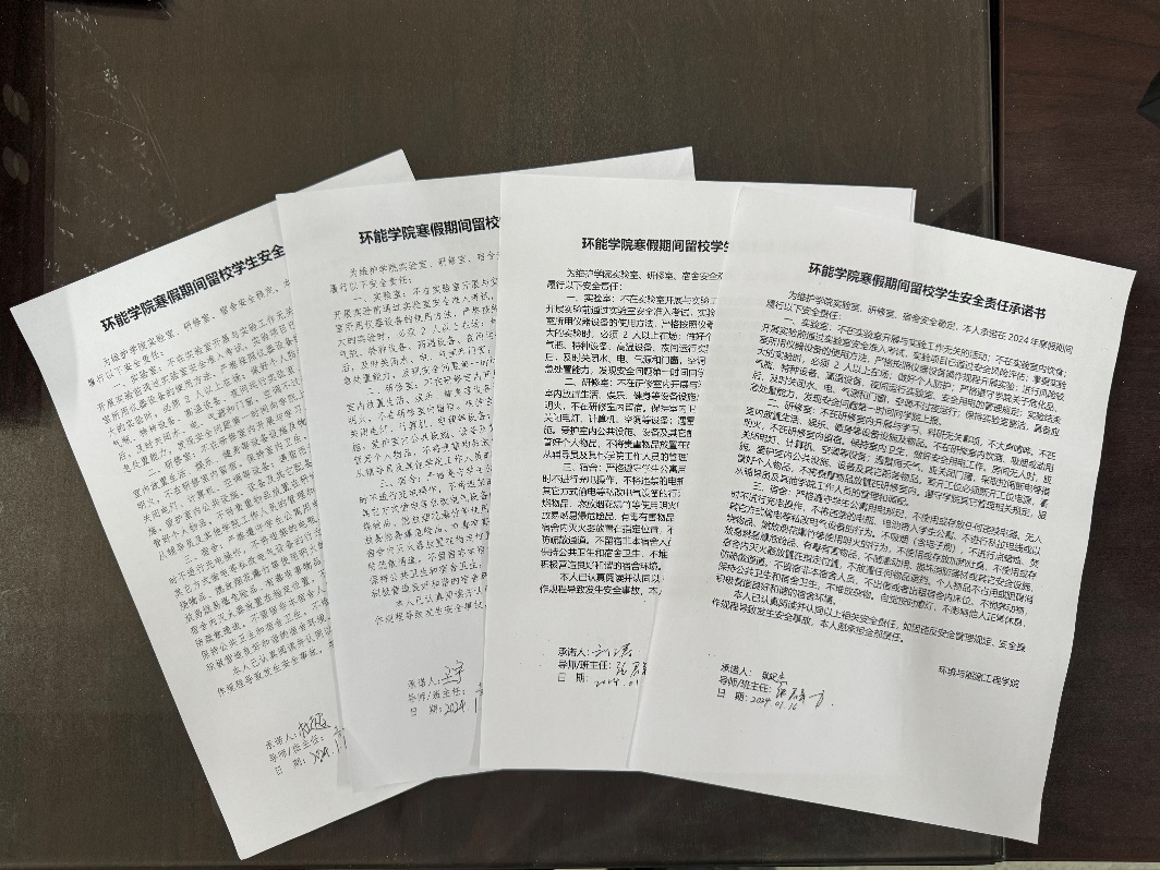 寒假期间留校学生安全责任承诺书》;学院对寒假期间暂停使用的实验室和雨水楼实验室张贴封条进行封闭管理,对开放使用实验室建立学院—实验室—课题组的三级管理体系,实行每日“零报告”制度,进一步完善了安全管理方法手段。