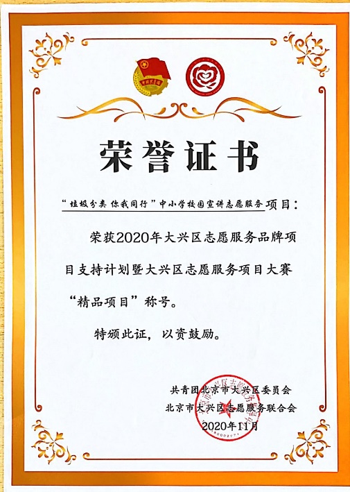 李颖教授参赛项目“垃圾分类宣讲进中小学校园”荣获2020年大兴区志愿服务品牌项目支持,并获得大兴区志愿服务项目大赛“精品项目”称号。