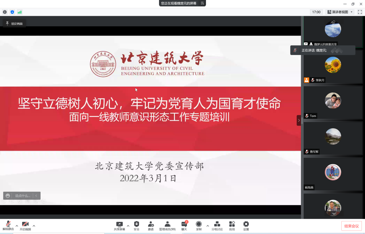 召开线上全体教职工大会,对新学期工作进行总体安排和全面部署。党委宣传部副部长(主持工作)魏楚元受邀参加会议并做专题讲座。学院全体教职工参会会议,会议由学院党委书记冯宏岳主持。