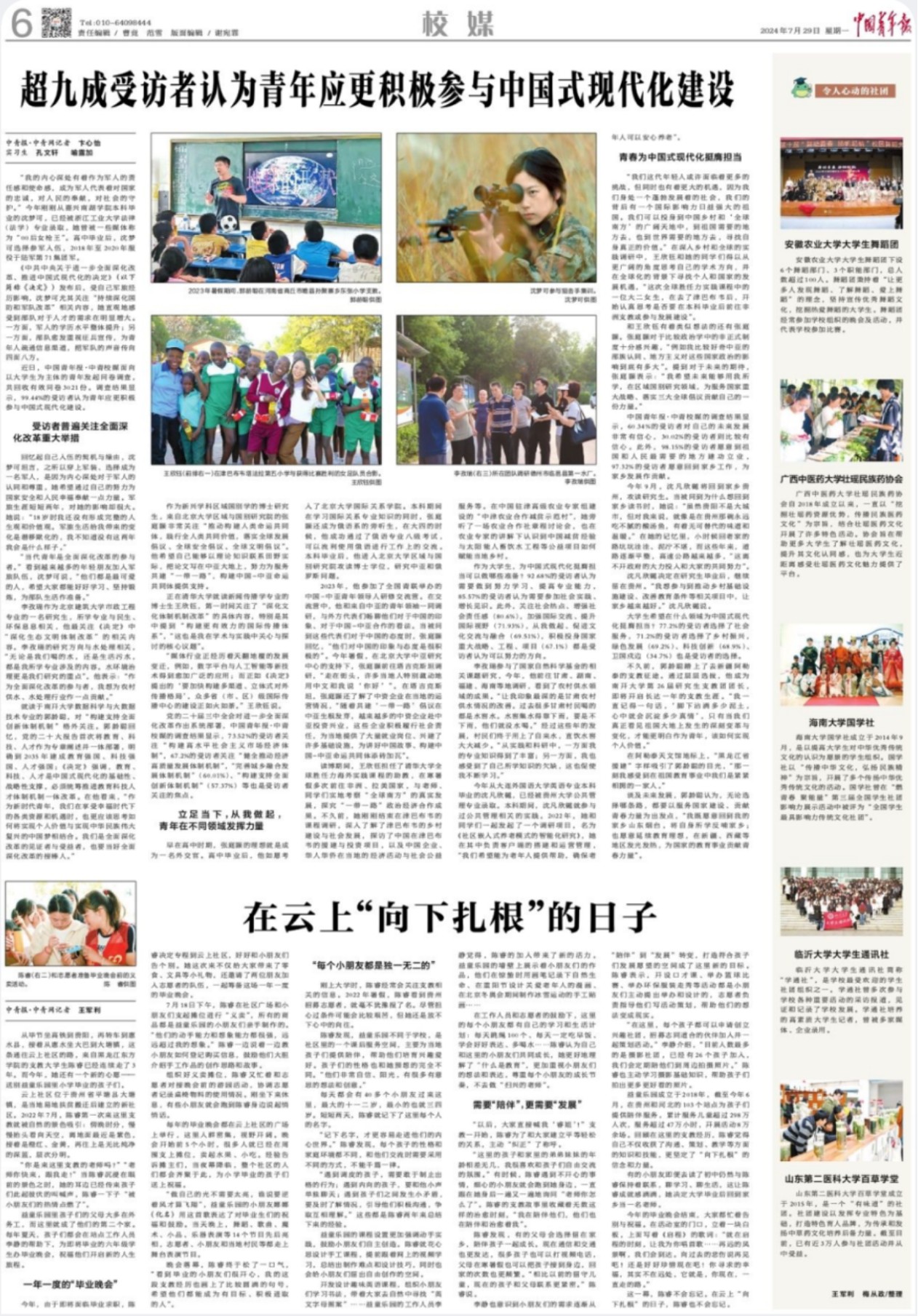 2024年7月29日,《中国青年报》第六版校媒栏目《超九成受访者认为青年应更积极参与中国式现代化建设》刊发了对我院2022级研究生李孜瑞的采访,就党的二十届三中全会全面深化改革、推进中国式现代化说出青年们的想法。相关报道被共青团中央转发。
