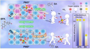 团队采用简单的室温静置法制备出ZnCo-ZIF前驱体,利用葡萄糖辅助热解策略制备出含有不对称Zn···OV···Co位点的OVs-ZnO/Co3O4催化剂,并通过EPR、XAS等多种表征方法进行验证。分别以富电子型污染物双酚A(BPA)和贫电子型污染物苯甲酸(BA)为目标污染物,通过催化性能实验、活性物质捕捉实验、ESR检测、预混合实验、i-t曲线以及Raman表征等方法对不同体系活化PMS去除污染物的效率和反应机理进行了探究。结果表明OVs-ZnO/Co3O4中的As-OVs分别通过介导电子转移途径(ETP)和自由基途径实现了富电子污染物BPA和贫电子污染物BA的超快去除(~ 1 min),催化性能远高于OVs-CoOx和OVs-ZnO中的对称氧空位(S-OVs)。实验及DFT计算表明PMS在As-OVs上具有“easy come, easy go”的催化行为,而在S-OVs上具有“easy come, not easy go”的催化行为。此外,OVs-ZnO/Co3O4还具有良好的可重复利用性、稳定性、抗干扰能力和低的生物毒性。OVs-ZnO/Co3O4/PMS体系对实际机场废水的COD去除率可达50%以上。该研究阐明了氧空位结构、PMS活化过程、目标污染物去除和氧化途径之间的关系,为合理设计能够精确控制有机污染物氧化途径的类Fenton催化剂提供了依据。基于上述结果,研究人员将能够通过定向构建具有As-OVs(Zn···OV···Co)的催化剂,建立具有按需选择性和可调氧化能力的PMS-AOPs系统,用于复杂水生环境中的有机净化。
