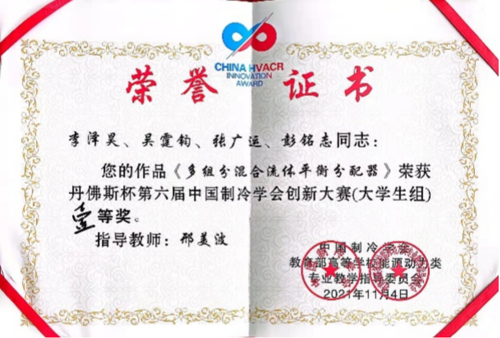 学生李泽昊、吴霆钧、张广运、彭铭志组队赢得“丹佛斯杯”第六届中国制冷学会创新大赛一等奖,指导老师正是邢美波,而参赛作品的研发想法,也源于课堂作业。