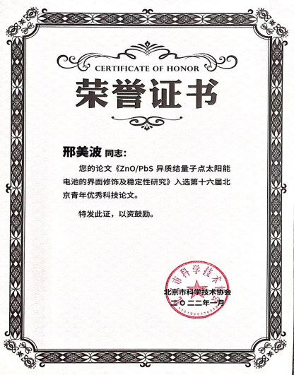 此外,邢美波还指导学生获得全国大学生节能减排社会实践与科技竞赛、“挑战杯”首都大学生课外学术科技作品竞赛、北京市大学生节能节水低碳减排社会实践与科技竞赛等赛事奖项。