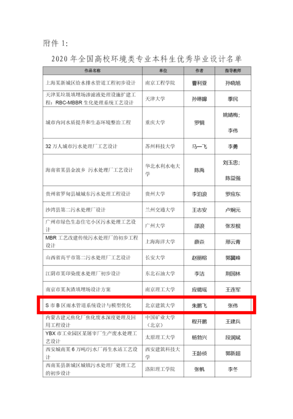 张伟副教授指导、2016级环境工程专业朱鹏飞同学毕业设计《S市B区雨水管道系统设计与模型优化》,荣获2020年度全国高校环境类专业本科生优秀毕业设计。