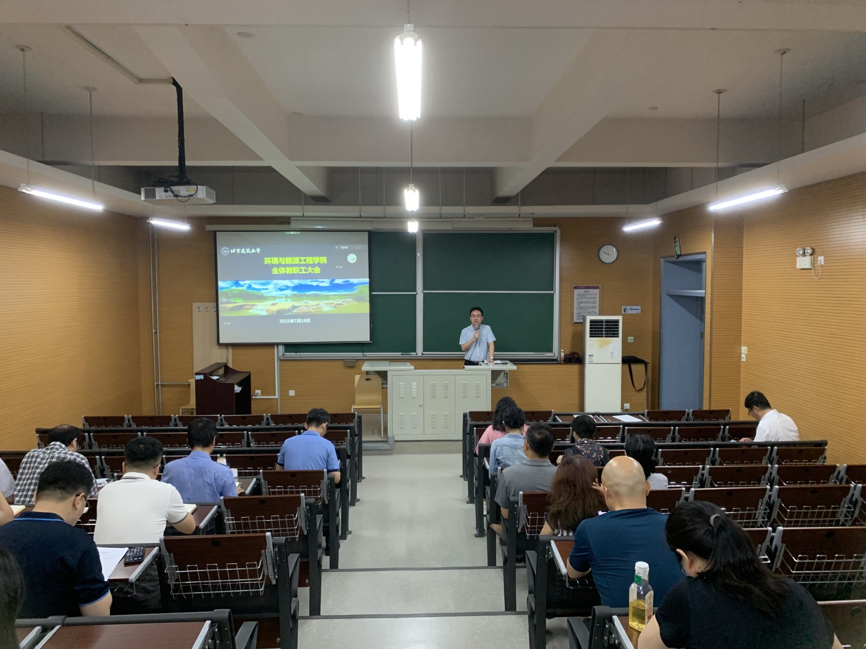 在学B-205召开全体教职工大会,会议由学院党委书记冯宏岳主持。