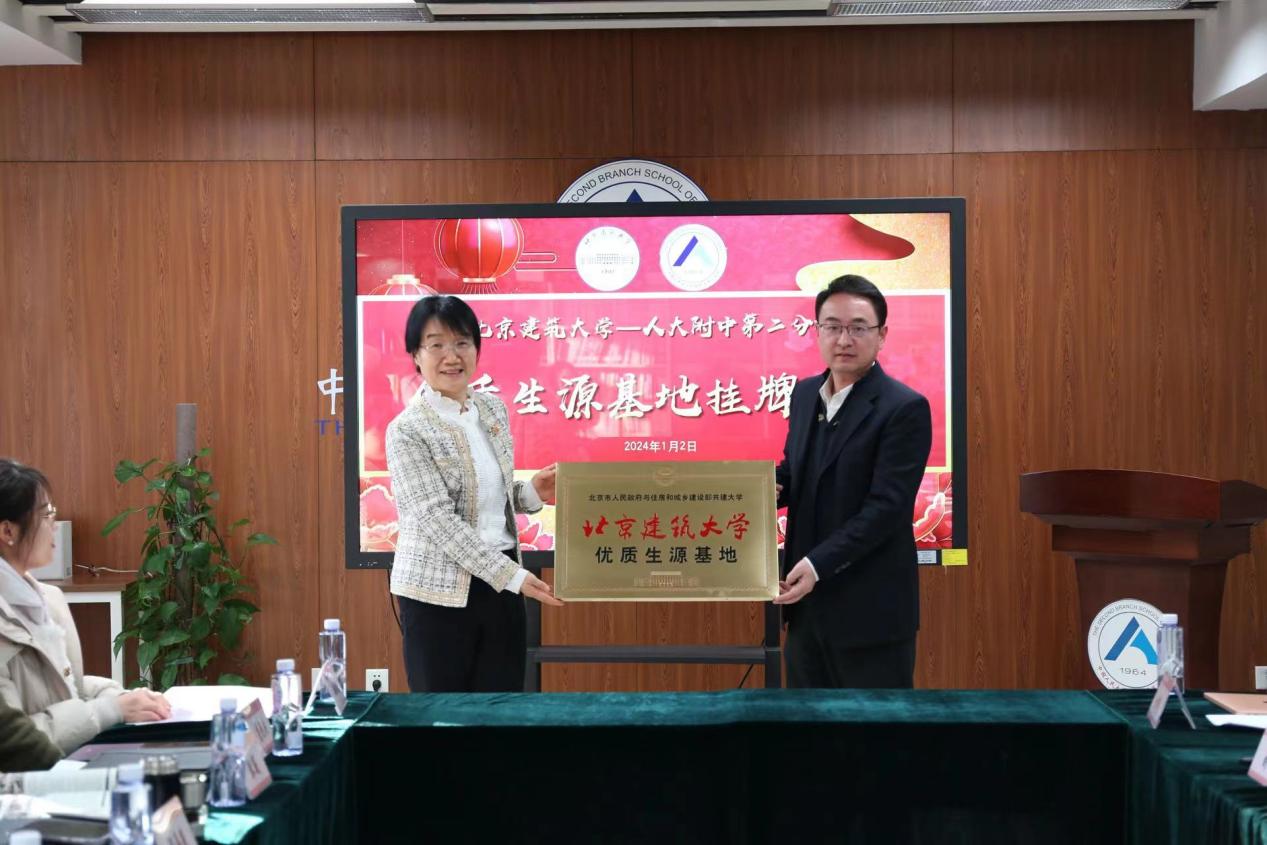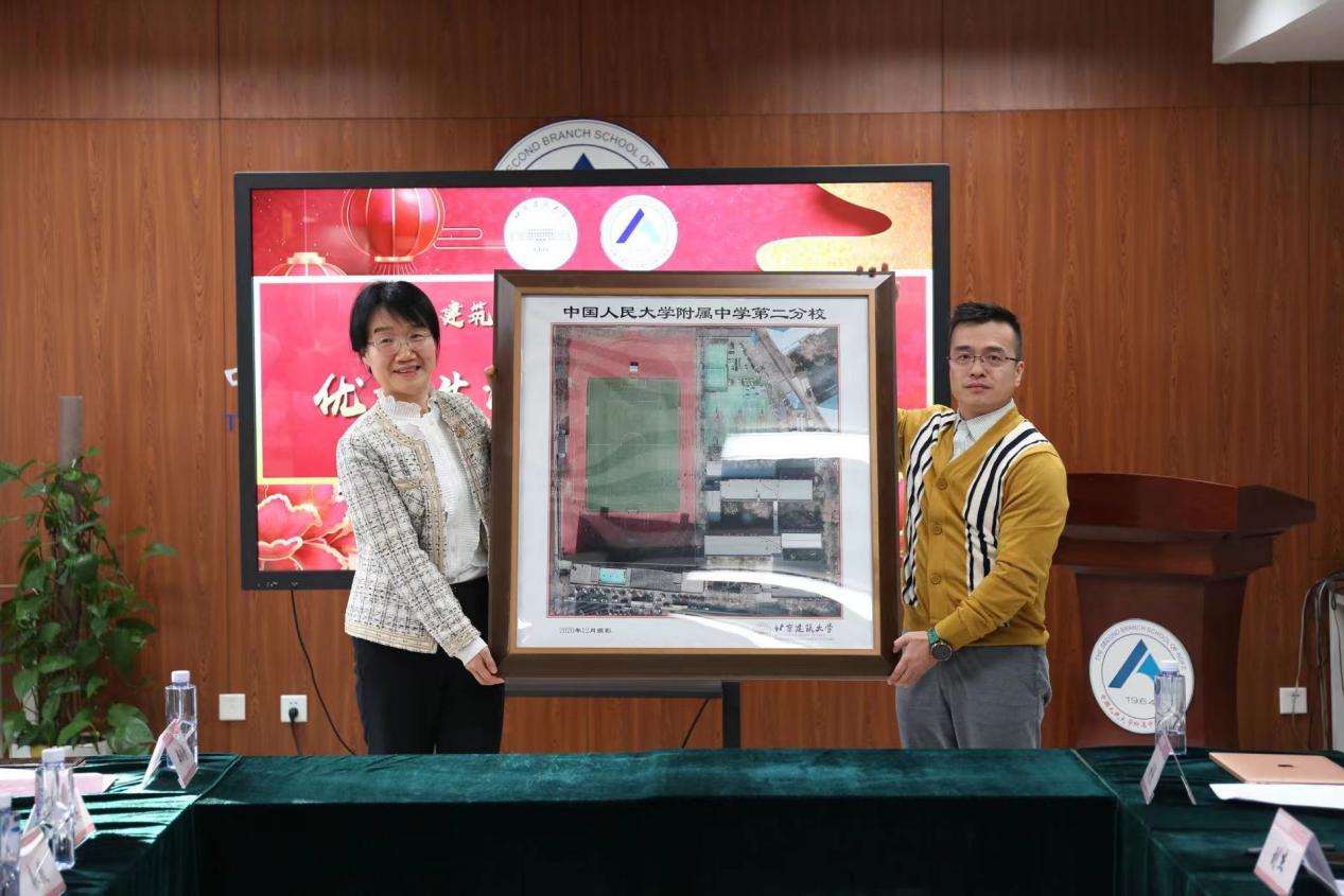 院长助理王俊岭,第一招生工作组、建筑与城市规划学院教授、博士生导师荣玥芳;中国人民大学附属中学第二分校党委书记、校长龚月萍,教学副校长李洪春,主管高中教学主任杨海燕,高中各年级组长等两校相关人员参加仪式并座谈。