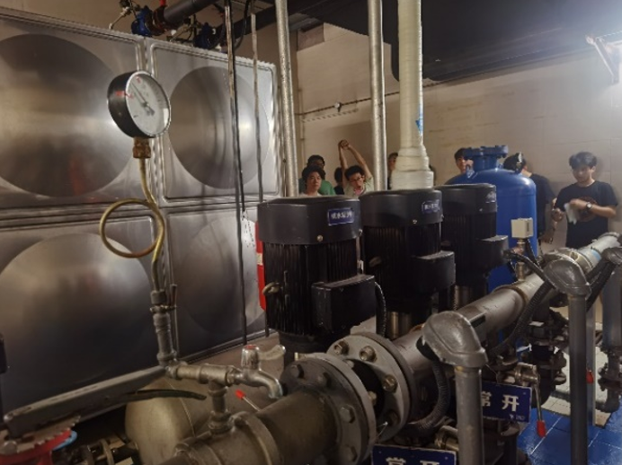 1月3日上午,同学们进行了“建水方向”参观实践。我院退休教师邵宗义老师的支持和协调下,大兴校区设备用房对学生开放参观。邵宗义老师对大兴校区整体供排水的方案进行了介绍,从系统角度讲解了大兴校区整个给水排水系统的设计思路和原理。随后,带着这样一个整体构想,学生分为6个组在许萍、杨海燕、刘然彬三位老师带领,对校区的给水泵房、消防泵房和热水供水泵房以及中水处理系统进行了参观学习。三位老师从建筑给排水的施工安装技术角度分别各系统泵房及中水处理间的设计原理、设备构成等内容进行了授课。