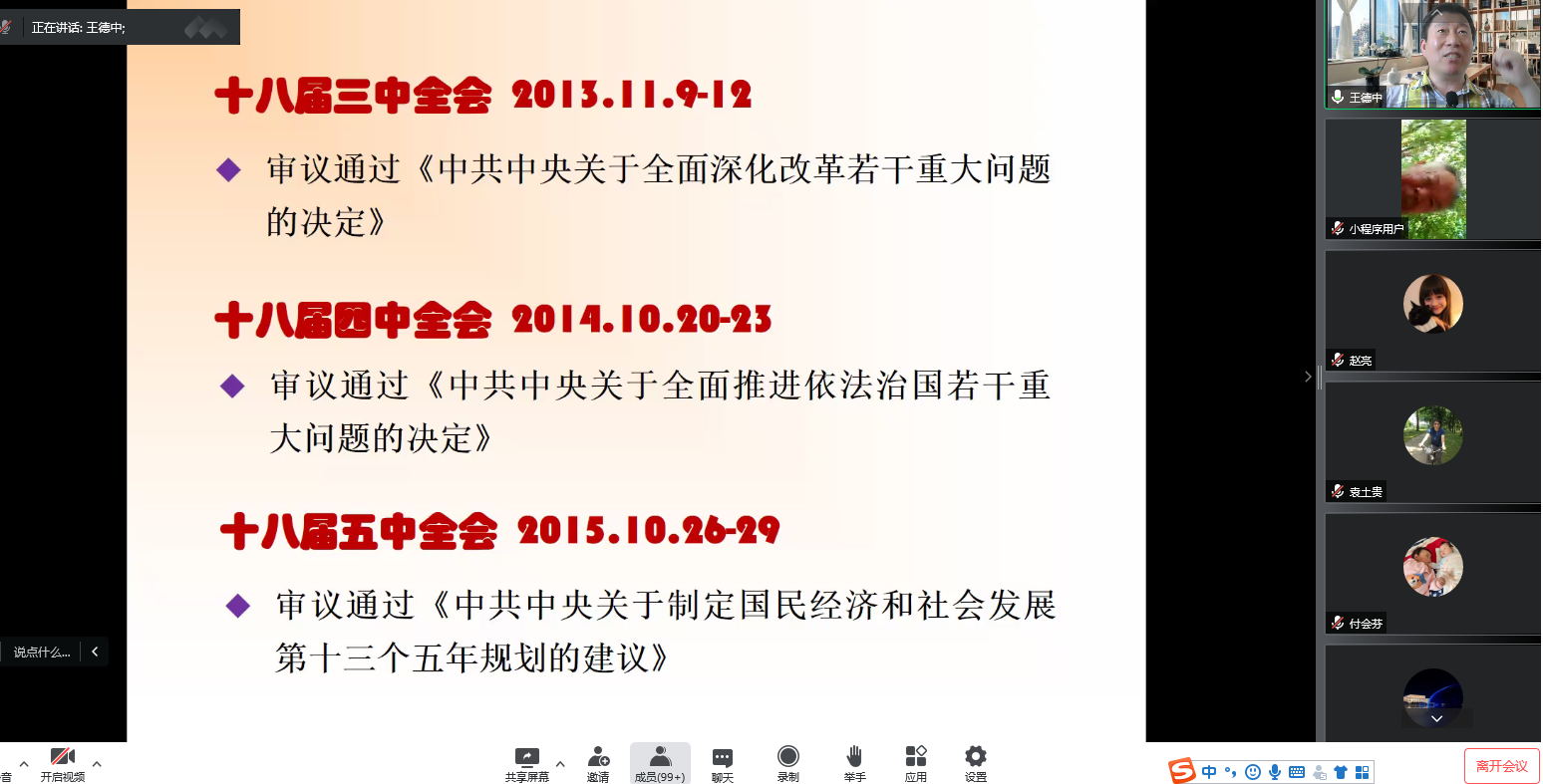 组织庆祝建党101周年专题党课—《从十八大以来历次中央全会看中国共产党治国理政特点》。党课由王德中教授主讲,党支部书记、学工系统负责人、专职组织员及师生党员代表等60余人参加了党课学习。