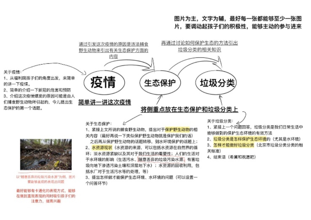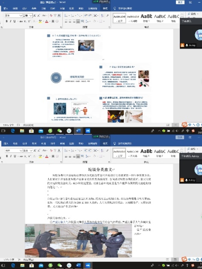 于七月底联系到北京市太阳村、北京市光爱公益学校,确定宣讲对象。活动前期,经本团队讨论以及和公益学校的老师确认,我们准备从疫情防控、野生动物保护、生态环保、垃圾分类四个方面开展宣讲。团队内分配各自任务查找相关文字视频资料、宣讲稿的制定、ppt制作。8月8日团队成员共同学习垃圾分类相关知识并分享心得。