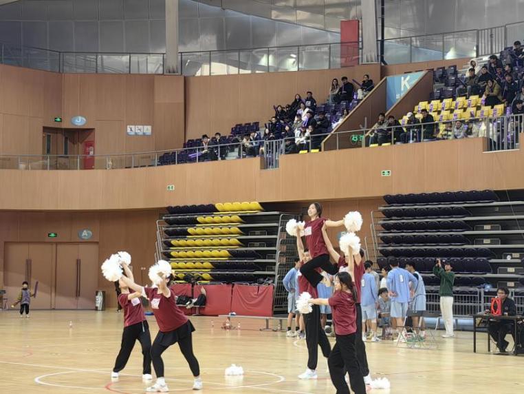 比赛间隙,身着红色院服的环能啦啦队更是赛场“热血引擎”,高难度托举、整齐划一的舞步搭配灵动旋转与有力踢腿,伴随着“环能!加油!”的齐声呐喊,为拼搏的队员们注入满满能量,成为球队最坚实的后盾。