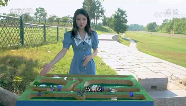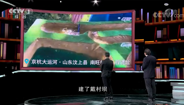 之后,镜头切换到南旺水利工程枢纽的现场,李晓玉以场外连线方式,利用团队自制的简易版沙盘模型,分享了该工程的运行原理。