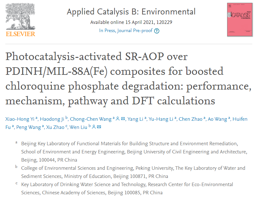王崇臣教授课题组的一篇题为“Photocatalysis-activated SR-AOP over PDINH/MIL-88A(Fe) composites for boosted chloroquine phosphate degradation: performance, mechanism, pathway and DFT calculations”的研究论文在国际权威期刊《Applied Catalysis B: Environmental》发表。低端影视