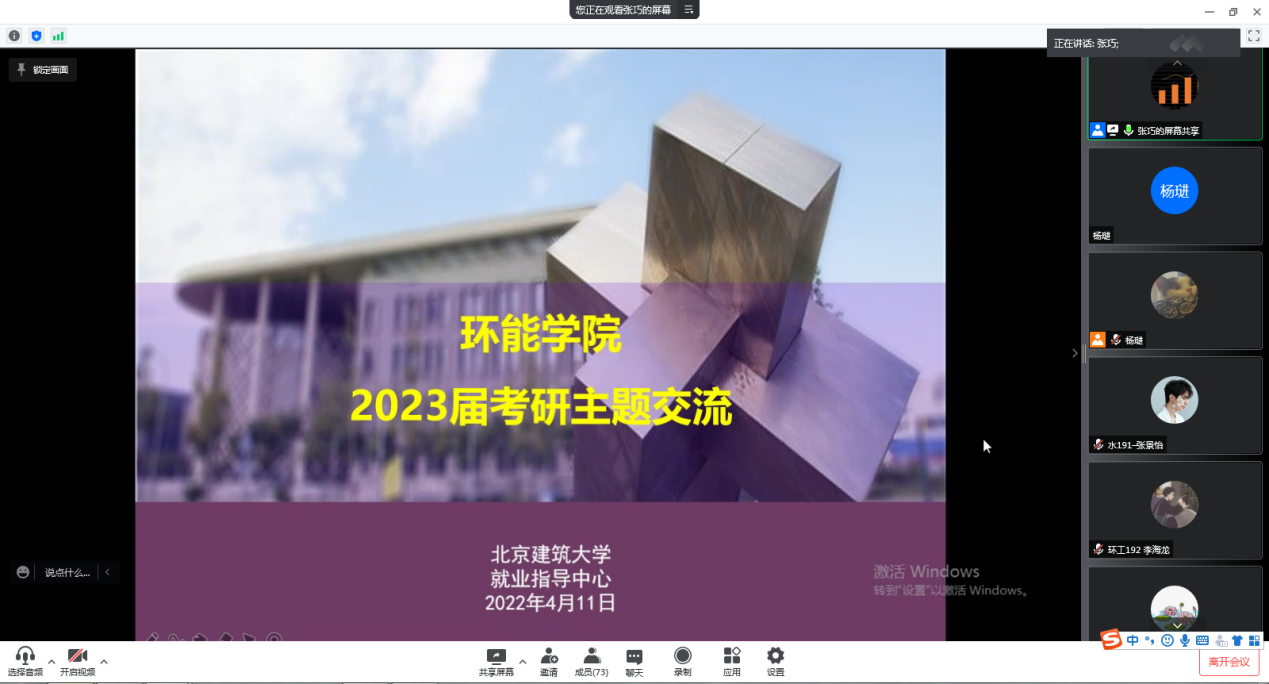 首先,张巧和陈启超老师分别就考研形势、理性择校及就业指导中心资源三方面向同学们给出参考建议。张老师提到,近年来,选择考研继续深造的大学生数量逐年递增,当前也正是大三年级学生面临抉择的关键阶段。她还向同学们提供了近年我院考研数据,给出了院校专业定级方式和理性择校的参考方法。
